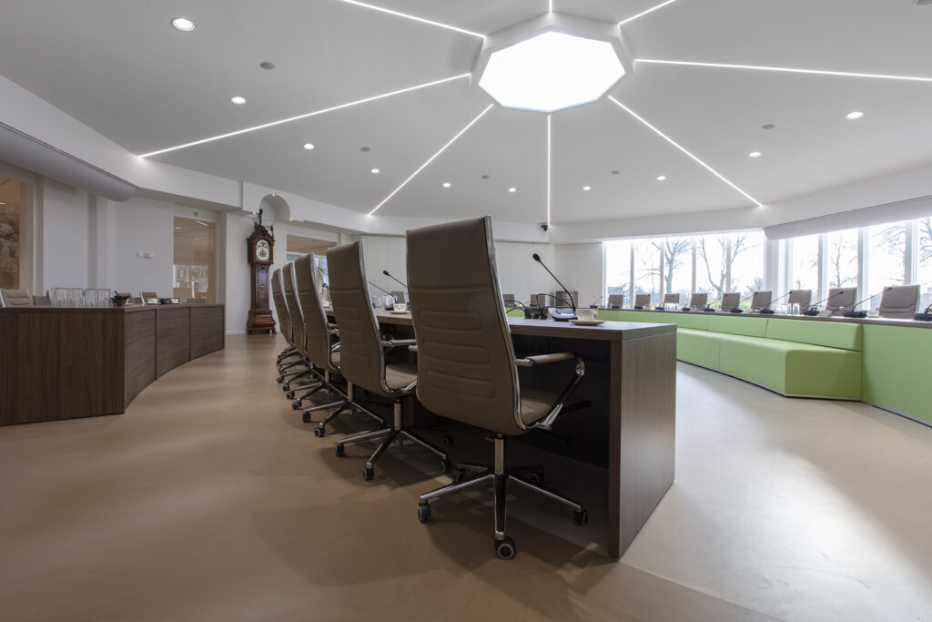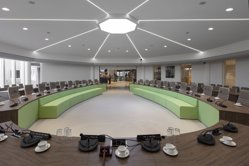 Wij hebben enige tijd geleden een project afgerond voor de raadzaal in Hendrik-Ido-Ambacht, het centrale punt voor gemeentelijke vergaderingen en besluitvorming. De ruimte is ontworpen om zowel formeel als uitnodigend te zijn, met aandacht voor uitstraling, akoestiek en comfort zodat er in een prettige omgeving vergaderd kan worden.