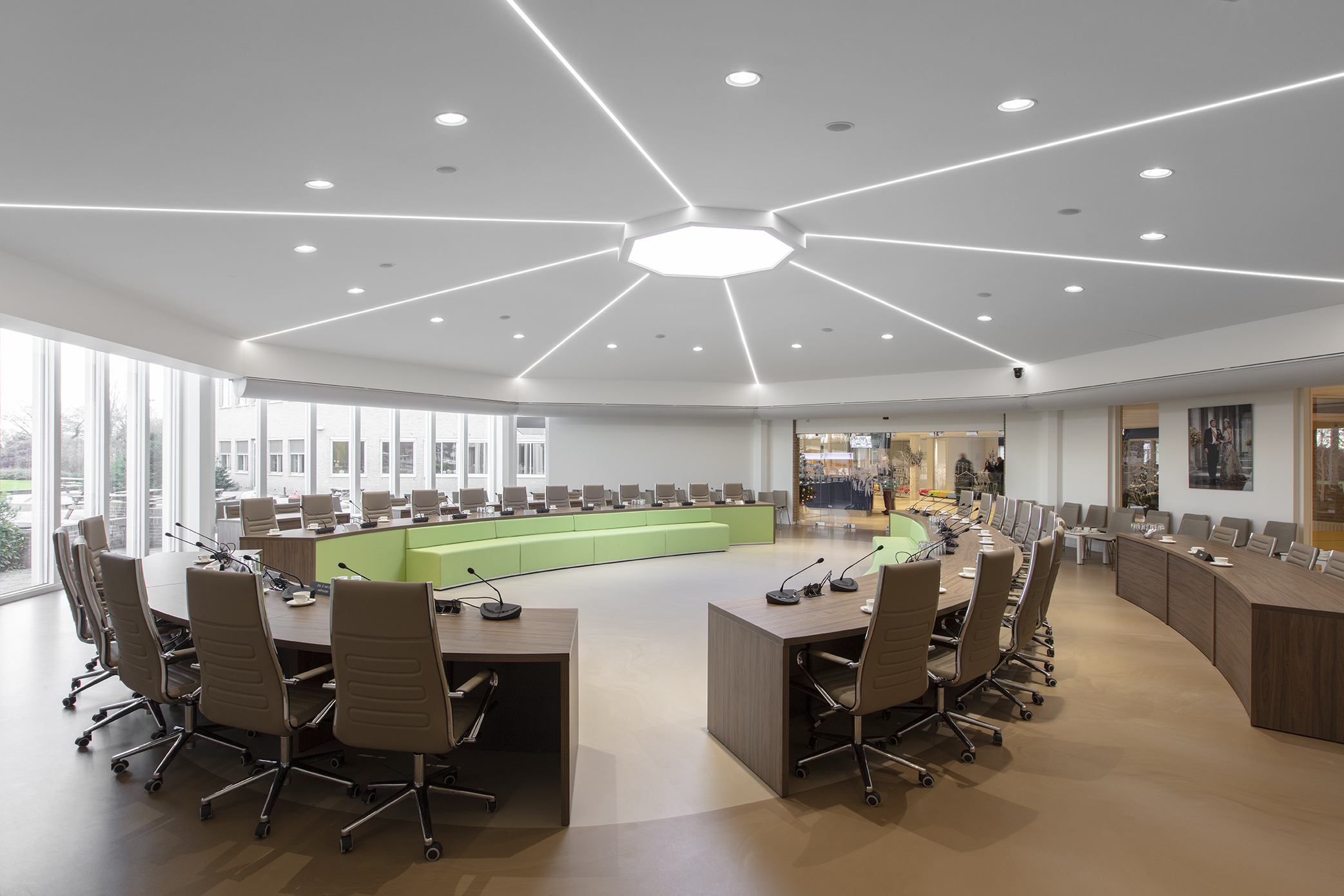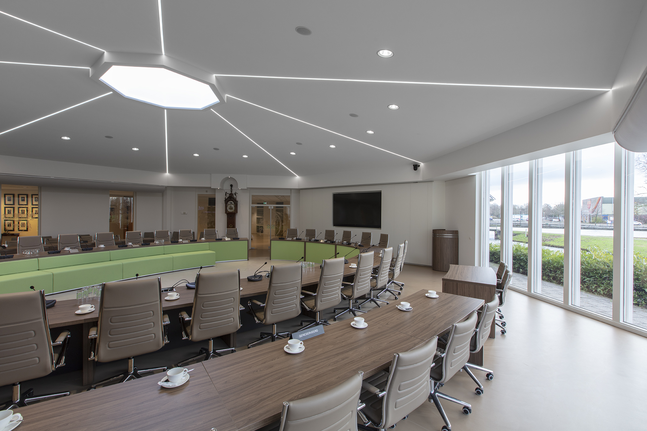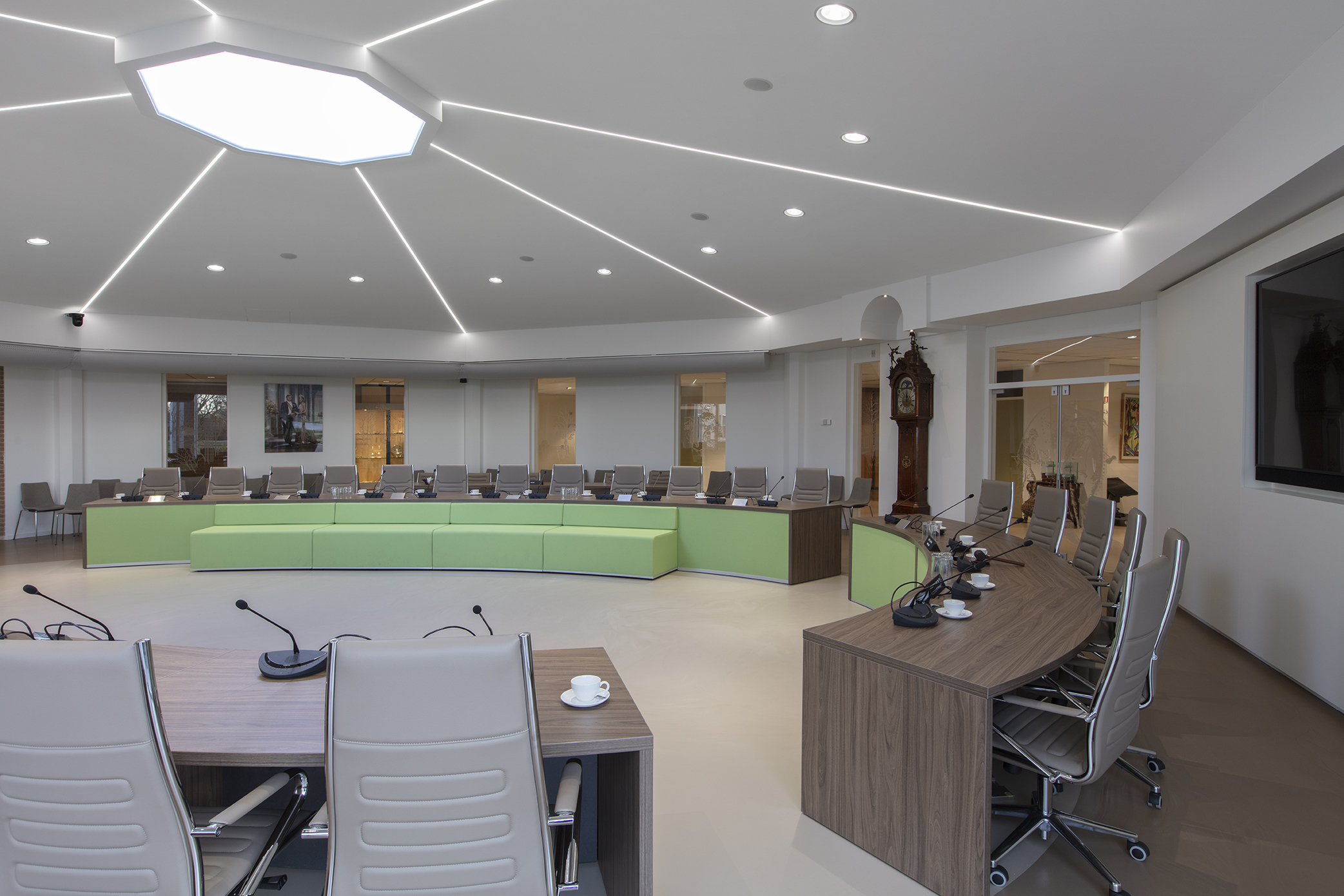 Wij hebben enige tijd geleden een project afgerond voor de raadzaal in Hendrik-Ido-Ambacht, het centrale punt voor gemeentelijke vergaderingen en besluitvorming. De ruimte is ontworpen om zowel formeel als uitnodigend te zijn, met aandacht voor uitstraling, akoestiek en comfort zodat er in een prettige omgeving vergaderd kan worden.